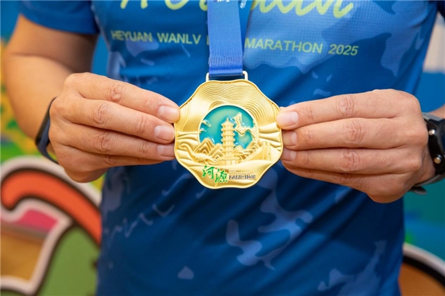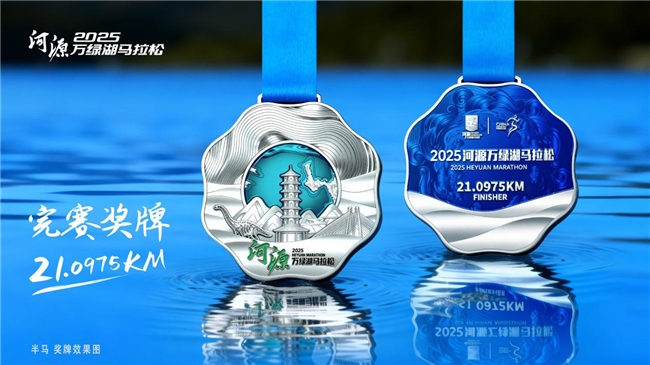 完賽獎(jiǎng)牌則以“客家古邑 萬綠河源”為設(shè)計(jì)靈感,正面湖水波紋與綠色島嶼相結(jié)合,與龜峰塔、萬綠湖等地標(biāo)建筑及恐龍化石元素相呼應(yīng),彰顯河源特有的自然風(fēng)光與人文精華。介紹過程中,模特身著參賽服、佩戴獎(jiǎng)牌上臺(tái)展示,簡(jiǎn)約時(shí)尚的設(shè)計(jì)與濃郁醇厚的文化氣息贏得了全場(chǎng)陣陣掌聲。