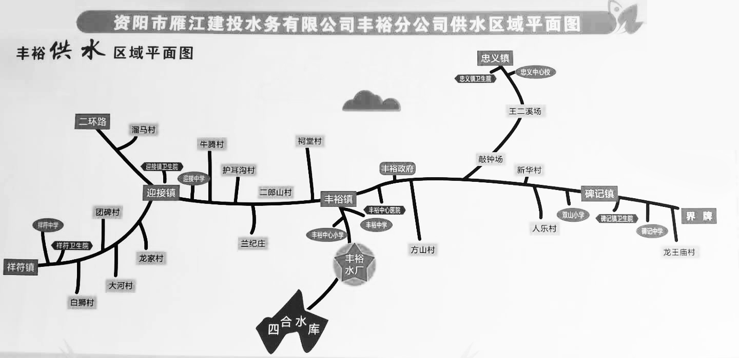 豐裕水廠是2010年第一批中央投資農(nóng)村飲水安全項(xiàng)目,資陽(yáng)市重點(diǎn)建項(xiàng)目雁江區(qū)示范性民生工程項(xiàng)目。工程建設(shè)時(shí)總投資為2549.06萬(wàn)元,設(shè)計(jì)日供水規(guī)模8000m³/d,供水主管網(wǎng)約43km,廠區(qū)位于雁江區(qū)豐裕鎮(zhèn)高石村四社,占地20余畝,源水來(lái)自四合水庫(kù),輸水方式為重力輸水。豐裕水廠于2010年10月開(kāi)始修建,于2011年5月修建完成,建成后水質(zhì)達(dá)到《國(guó)家生活飲用水衛(wèi)生標(biāo)準(zhǔn)》。已解決雁江區(qū)豐裕、迎接、碑記、祥符、忠義5個(gè)鎮(zhèn)31個(gè)村的6.7萬(wàn)人的飲用水不安全問(wèn)題。